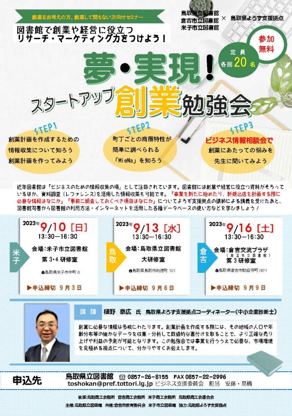 【募集は終了しました】(鳥取県立図書館より)9/10米子市立図書館、9/13鳥取県立図書館、9/16倉吉市立図書館「夢・実現!スタートアップ創業勉強会」開催のお知らせ