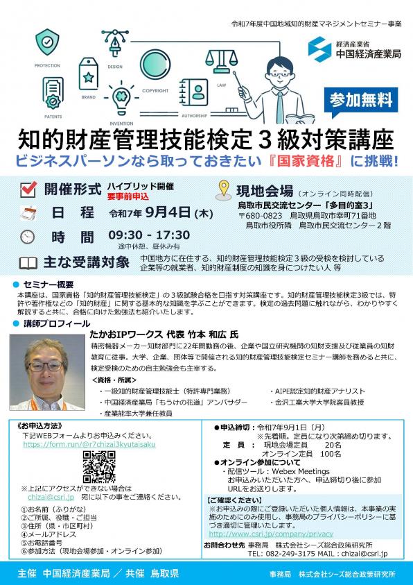 【募集は終了しました】(中国経済産業局より)9/4開催「知的財産管理技能検定3級対策講座」のご案内(リアル会場:鳥取市民交流センター)
