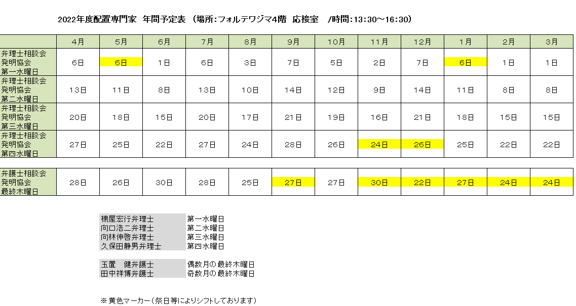 令和4年度配置専門家 年間予定スケジュールについて