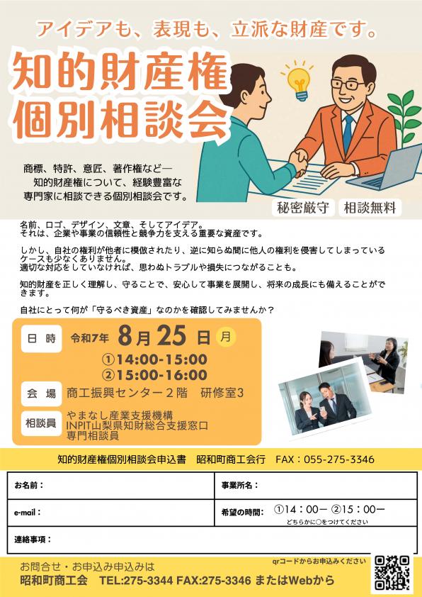 ≪終了≫「知的財産権個別相談会」のご案内(昭和町商工会)【8/25(月)】